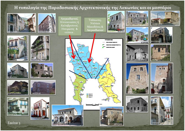 Τα παραδοσιακά κτίρια της Λακωνίας, από πλευράς τυπολογίας των κυρίαρχων τύπων, μπορούν να καταταγούν σε τρεις κύριες ομάδες, όπως φαίνεται και στον διπλανό χάρτη, [Εικόνα 3] :