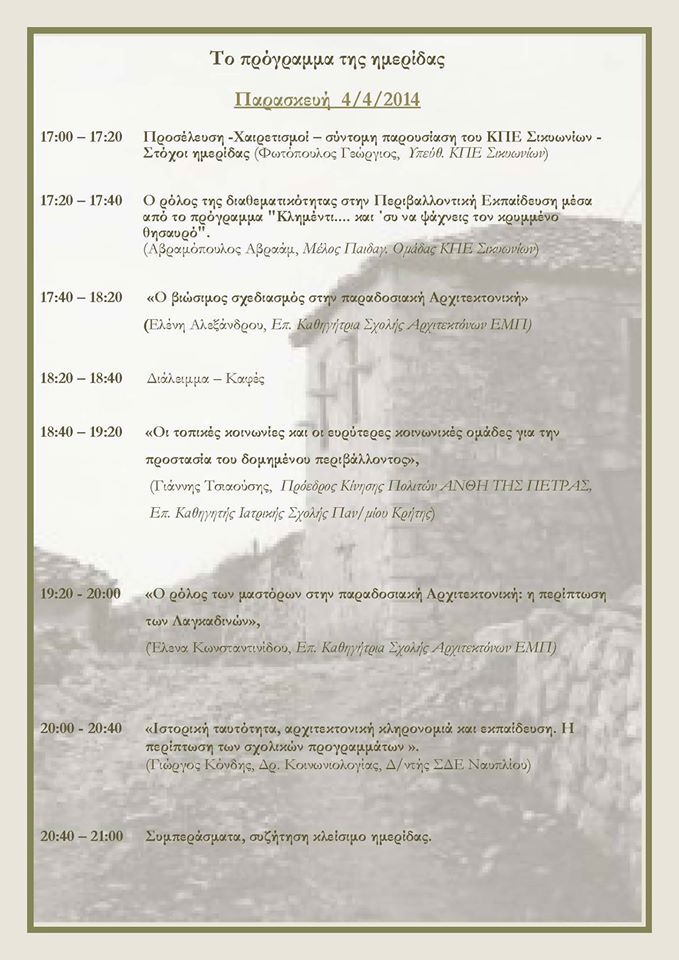 Παράλληλα, οι εκπαιδευτικοί Γιώργος Φωτόπουλος, Αβραάμ Αβραμόπουλος και Γιώργος Κόνδης παρουσίασαν την εμπειρία τους για το ρόλο της διαθεματικότητας στην περιβαλλοντική εκπαίδευση μέσα απ’ το εκπαιδευτικό πρόγραμμα που έχουν σχεδιάσει και υλοποιούν. Επιπροσθέτως, όλοι οι εισηγητές ανέδειξαν τη σημασία της αρχιτεκτονικής κληρονομιάς στο συγκεκριμένο εκπαιδευτικό πλαίσιο. Την ημερίδα παρακολούθησε σημαντικός αριθμός εκπαιδευτικών της Κορινθίας, ενώ μετά τις εισηγήσεις ακολούθησε μια ιδιαίτερα παραγωγική συζήτηση