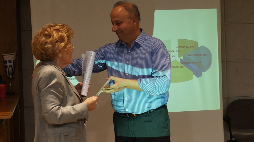 Την ομόφωνη ψήφιση του απολογισμού και της έκθεσης της Εξελεγκτικής Επιτροπής που εισηγήθηκε ο Πρόεδρός της Σπύρος Τσαφαράς, ακολούθησε η απονομή τιμητικών επαίνων στην Πόπη Βαλτή-Παπακωνσταντίνου και τον Χαράλαμπο Σπ. Τσαφαρά για τη σημαντική συμβολή τους στην υλοποίηση των σκοπών των Ανθέων την περασμένη τριετία.