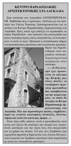 Κατά τη διάρκεια των τελευταίων πέντε μηνών που η Κίνησή μας έβαλε ως στόχο και υλοποίησε την αγορά του αρχοντικού Ρηγόπουλου, με σκοπό να αποτελέσει την έδρα του Κέντρου Παραδοσιακής Αρχιτεκτονικής στα Λαγκάδια Αρκαδίας, η προσφορά του Τύπου ήταν ιδιαίτερα σημαντική. Η συμβολή των ηλεκτρονικών και έντυπων μέσων ήταν ουσιαστική στην προώθηση της ιδέας και την πραγμάτωση του στόχου μας. Ηλεκτρονικά μέσα όπως το ARCADIA PORTAL, το KALIMERA ARKADIA, το DRT 915, το LAGKADIA BLOGSPOT.COM και εφημερίδες όπως η ΗΧΩ ΤΩΝ ΛΑΓΚΑΔΙΩΝ, η ΓΟΡΤΥΝΙΑ, ο ΑΡΤΟΖΗΝΟΣ, και οι ΑΡΚΑΔΙΚΟΙ ΟΡΙΖΟΝΤΕΣ στάθηκαν στο πλευρό μας και τους ευχαριστούμε ιδιαίτερα!