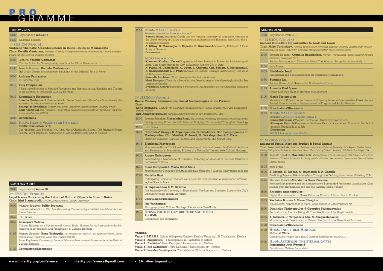 Με μεγάλη επιτυχία ολοκληρώθηκε το 4ο Διεθνές Συνέδριο για τη διαχείριση της πολιτιστικής κληρονομιάς (HERMA Conference), πού πραγματοποιήθηκε στην Ελευσίνα 22-24 Σεπτεμβρίου 2017 και διοργανώθηκε από τον Οργανισμό HMO (HERITAGE MANAGEMENT ORGANIZATION) σε συνεργασία με το Οικονομικό Πανεπιστήμιο Αθηνών, το Πανεπιστήμιο του KENT, τον Οργανισμό Ελευσίνα 2021-Πολιτιστική Πρωτεύουσα της Ευρώπης, το Φεστιβάλ ΑΙΣΧΥΛΕΙΑ και το Δήμο Ελευσίνας.