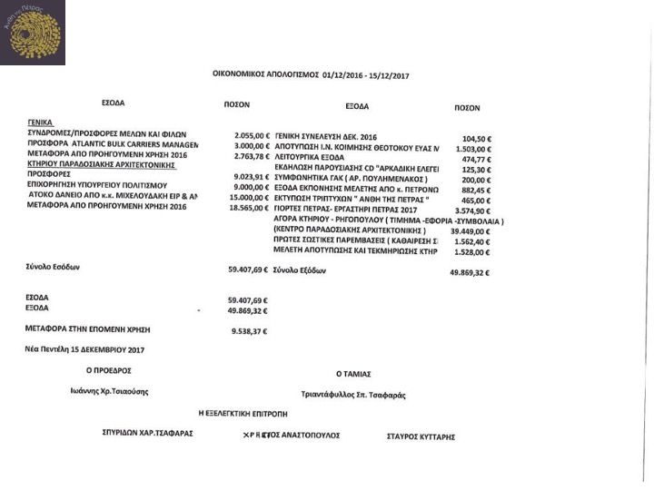 Στο πλαίσιο της απόλυτα διαφανούς οικονομικής λειτουργίας των Ανθέων της Πέτρας αναρτούμε στην ιστοσελίδα μας τον οικονομικό απολογισμό του 2017. Ο απολογισμός ελέγχθηκε από την Εξελεγκτική Επιτροπή και παρουσιάστηκε στην ετήσια Γενική Συνέλευση της Κίνησής μας στις 17 Δεκεμβρίου από τον ταμία του ΔΣ κ. Τριάδη Τσαφαρά. Ο απολογισμός απεικονίζει ανάγλυφα το ποιοτικό και ποσοτικό άλμα στις δράσεις και πρωτοβουλίες των Ανθέων. Η Γενική Συνέλευση τον ψήφισε ομόφωνα και απάλλαξε τα μέλη του ΔΣ.