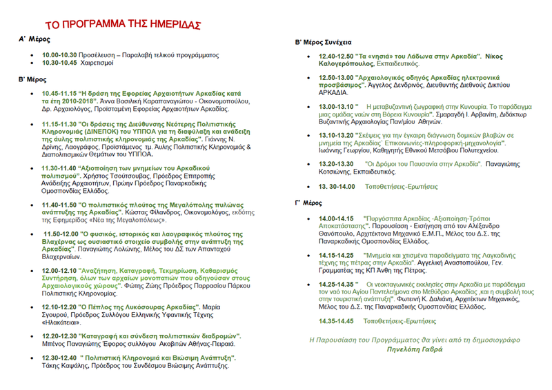 Ιδιαίτερα επιτυχημένη ήταν η ημερίδα «Μνημεία της Αρκαδίας-Τόποι και Ιστορία» που διοργανώθηκε από την Παναρκαδική Ομοσπονδία Ελλάδας και την Εφορεία Αρχαιοτήτων Αρκαδίας, την Κυριακή 6 Μαίου 2018, στην Αθήνα. Συζητήθηκαν θέματα πού αφορούν την συγκέντρωση, μελέτη, συντήρηση, προβολή και αξιοποίηση του ...