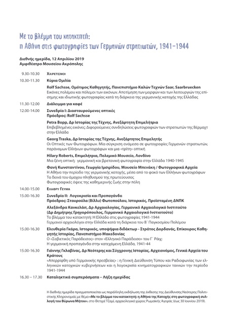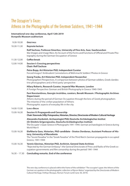 Σε αυτά και μια σειρά από άλλα ερωτήματα, αναφορικά με τις συνθήκες που οδήγησαν στη φωτογραφική παραγωγή της κατοχικής Αθήνας, επιχειρεί να δώσει απαντήσεις η περιοδική έκθεση «Με το βλέμμα του κατακτητή: η Αθήνα της Κατοχής στη φωτογραφική συλλογή του Βύρωνα Μήτου». Κορυφαίο γεγονός στο πλαίσιο αυτής της έκθεσης είναι η διεθνής ημερίδα που διοργανώνεται με τη συνεργασία της Διεύθυνσης Νεότερης Πολιτιστικής Κληρονομιάς του ΥΠΠΟΑ, του Μουσείου Μπενάκη, του Μουσείου της Ακρόπολης και των Ανθέων της Πέτρας. Ένας σημαντικός αριθμός Ελλήνων και ξένων επιστημόνων θα προσεγγίζει τα παραπάνω και άλλα συναφή ζητήματα στην ημερίδα που διοργανώνεται στο Αμφιθέατρο του Μουσείου της Ακρόπολης την Παρασκευή 12 Απριλίου.