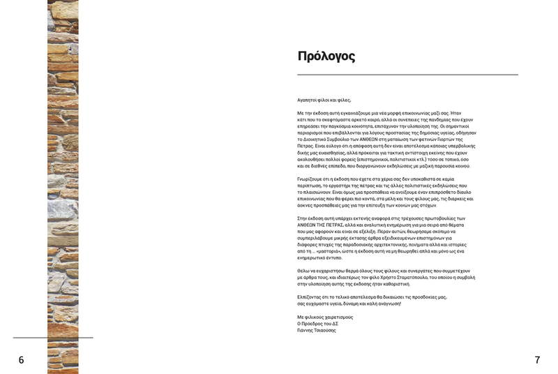Για την αναπλήρωση αυτού του ελλείμματος άμεσης επικοινωνίας που έχει προκύψει φέτος αποφασίσαμε να προχωρήσουμε σε μια ειδική έκδοση που έχει διττό χαρακτήρα. Από τη μία πλευρά είναι ενημερωτικό για τις δράσεις των Ανθέων που συνεχίζονται σε διάφορους τομείς και από την άλλη έχει ένα διαχρονικό χαρακτήρα που διαμορφώνεται με μια σειρά θεμάτων γύρω από τον άξονα παραδοσιακή αρχιτεκτονική-πολιτιστική κληρονομιά.