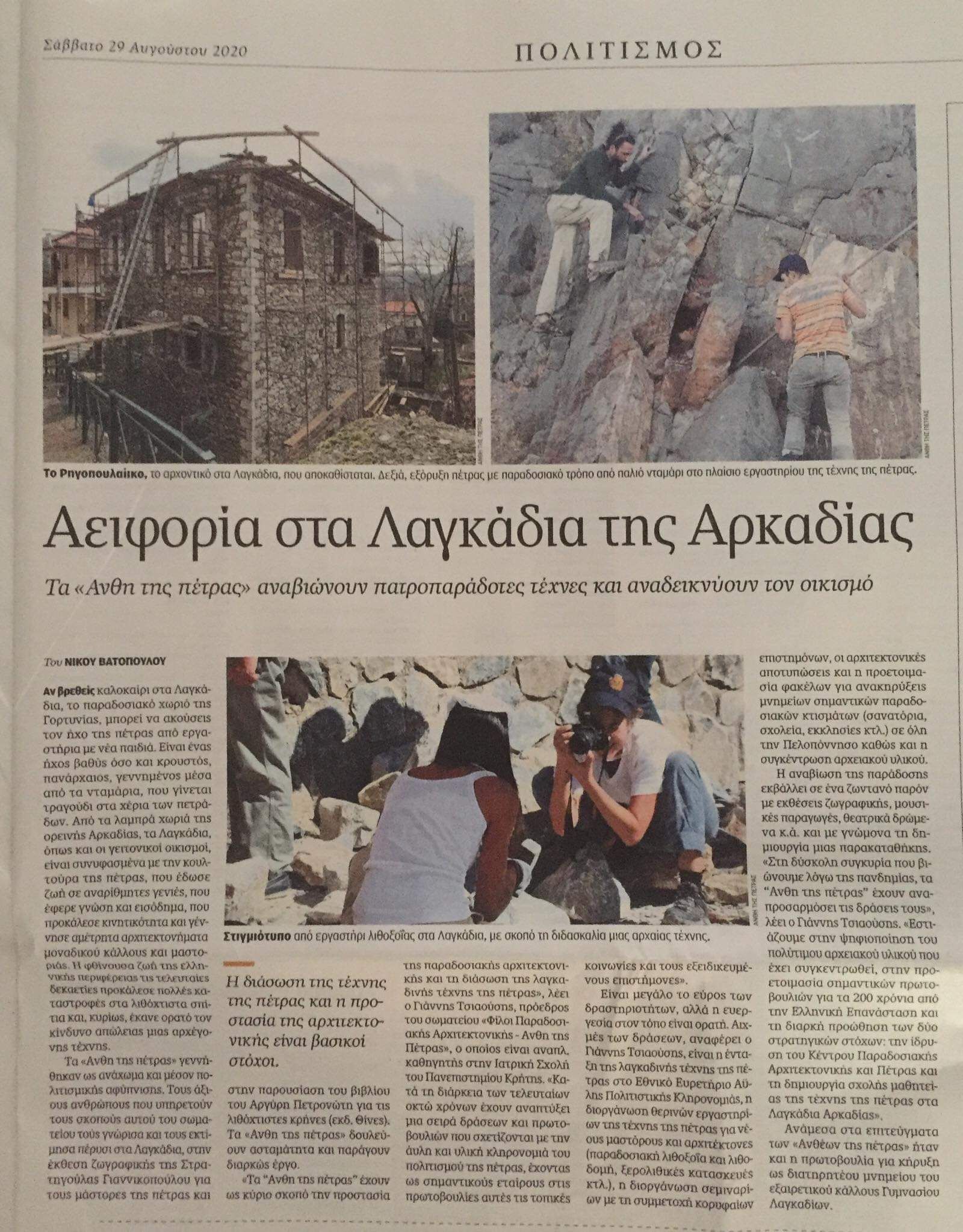 Ο γνωστός και καταξιωμένος δημοσιογράφος καθώς και υπεύθυνος των πολιτιστικών σελίδων της εφημερίδας Η ΚΑΘΗΜΕΡΙΝΗ Νίκος Βατόπουλος υπογράφει εκτενές άρθρο με θέμα τις πρωτοβουλίες των Ανθέων της Πέτρας στο φύλλο του Σαββάτου 29 Αυγούστου 2020. Μέσα από την υψηλής ποιότητας γραφή του κ. Βατόπουλου αναδεινύονται η σημασία και τα αποτελέσματα της πολυσχιδούς δραστηριότητας του σωματείου μας αλλά και οι βασικοί άξονες των δράσεων που λαμβάνουν χώρα στις δύσκολες συνθήκες της πανδημίας όπως παρουσιάζονται από τον πρόεδρό μας Γιάννη Τσιαούση.