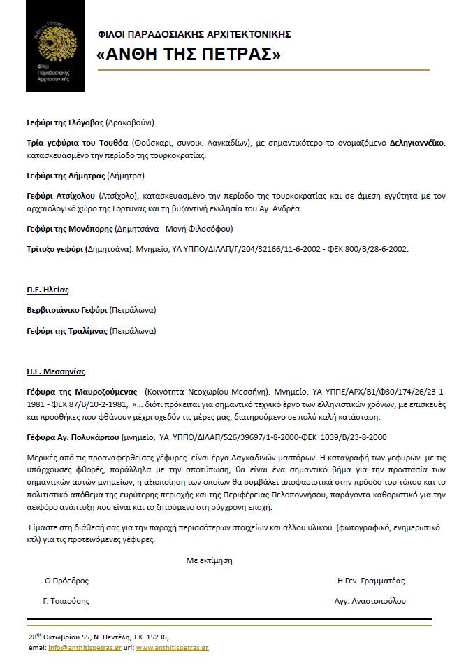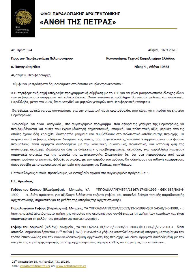 Με βάση την προγραμματική σύμβαση Περιφέρειας Πελοποννήσου – ΤΕΕ τα Άνθη της Πέτρας απευθύνθηκαν με επιστολή τους στον περιφερειάρχη κ. Π. Νίκα ζητώντας να ενταχθούν στο πρόγραμμα 15 παραδοσιακά γεφύρια της Πελοποννήσου ανεξαρτήτως αν είναι ενταγμένα σήμερα στο οδικό δίκτυο της Περιφέρειας. Στην επιστολή τονίζεται η παραπάνω αναγκαιότητα για τις γέφυρες «…που έχουν ιδιαίτερη αρχιτεκτονική, ιστορική και πολιτιστική αξία, μερικές από τις οποίες έχουν ήδη κηρυχθεί διατηρητέα μνημεία και συμβάλλουν στο πολιτιστικό απόθεμα της περιοχής. Τα πέτρινα αυτά γεφύρια, εξαίρετα δείγματα της λαϊκής μας αρχιτεκτονικής, απόλυτα εναρμονισμένα στο φυσικό περιβάλλον, είναι άρρηκτα συνδεδεμένα με την κοινωνική, οικονομική, πολιτιστική, και ιστορική ζωή της αντίστοιχης περιοχής, ιδιαίτερα σε όλη τη διάρκεια της προβιομηχανικής περιόδου, ενώ παράλληλα παρέχουν σημαντικά στοιχεία για την ιστορία της αρχιτεκτονικής. Σημειωτέον δε, ότι στα περισσότερα από αυτά παρατηρούνται σημαντικές φθορές οι οποίες, με την πάροδο του χρόνου, θα οδηγήσουν σε πιθανή κατάρρευση, όπως συνέβη με το αρχιτεκτονικό μνημείο της γέφυρας της Πλάκας, στην Ήπειρο». Ο κατάλογος των 15 γεφυριών περιλαμβάνει: