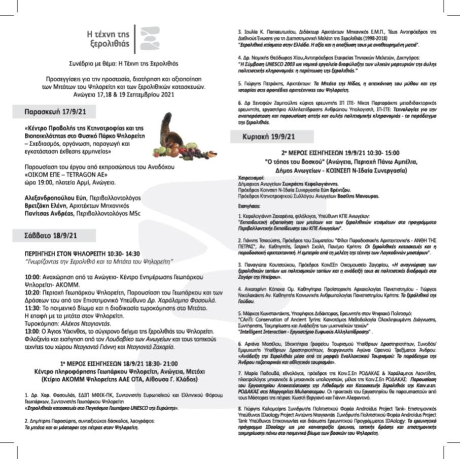 Δεν είναι τυχαίο ότι το φετινό φθινόπωρο διοργανώνονται εργαστήρια και σεμινάρια σε διάφορα μέρη της χώρας μας με θέμα την τέχνη της ξερολιθιάς, αρχής γενομένης από τα Ανώγεια της Κρήτης στη διάρκεια του τριήμερου 17-19 Σεπτεμβρίου 2021.
