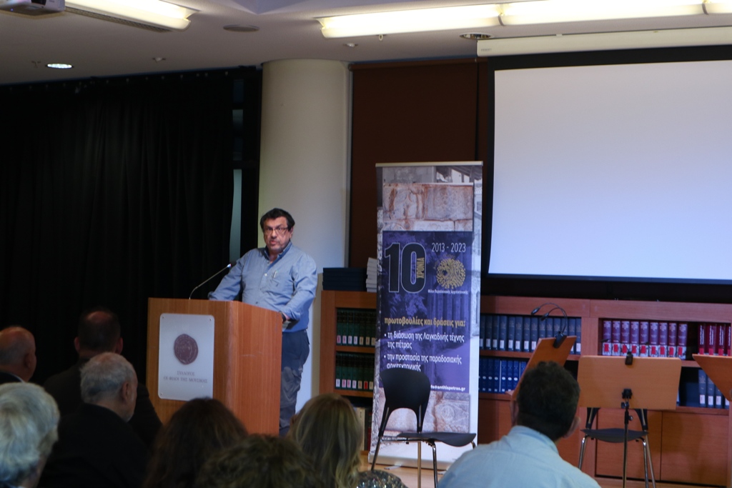 Εξαιρετική επιτυχία σημείωσε η εκδήλωση των ΑΝΘΕΩΝ ΤΗΣ ΠΕΤΡΑΣ που πραγματοποιήθηκε στις 13 Δεκεμβρίου 2023, στο Μέγαρο Μουσικής Αθηνών, με την ευκαιρία της συμπλήρωσης των 10 ετών παρουσίας του Σωματείου, με θέμα «Πρωτοβουλίες και ψηφιακές δράσεις για την Παραδοσιακή Αρχιτεκτονική». Η εκδήλωση είχε ενταχθεί στο πρόγραμμα των Επετειακών Δράσεων της Διεύθυνσης Νεότερης Πολιτιστικής Κληρονομιάς του ΥΠΠΟΑ, εν όψει της συμπλήρωσης 20 ετών από την υιοθέτηση της Σύμβασης για τη Διαφύλαξη της Άυλης Πολιτιστικής Κληρονομιάς (UNESCO 2003) .