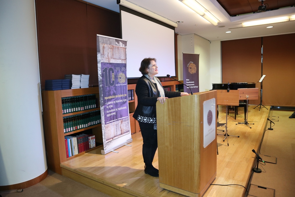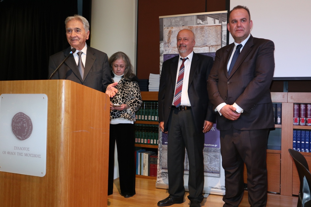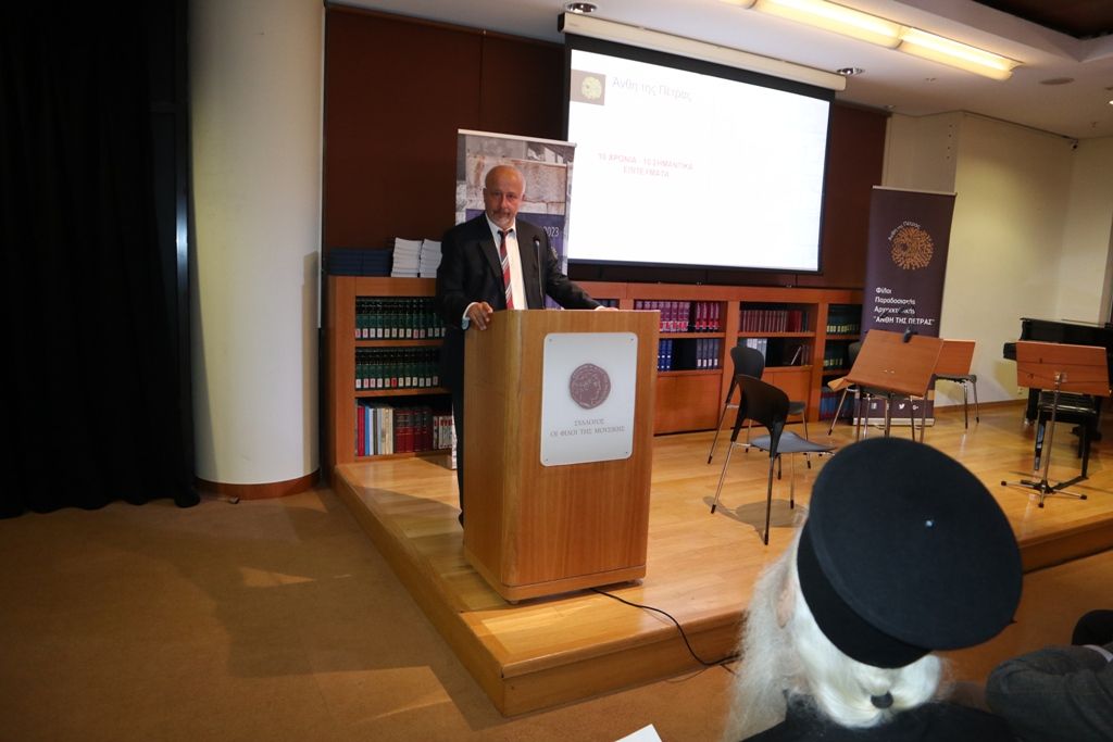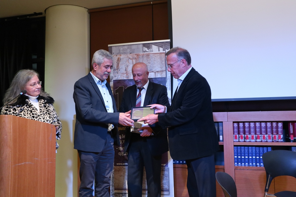 Στο πρώτο μέρος της εκδήλωσης, τρείς πολύ ενδιαφέρουσες εισηγήσεις, απέσπασαν το ενδιαφέρον του πολυπληθούς κοινού που ήταν παρόν, στο Μέγαρο Μουσικής. Αρχικά ο Πρόεδρος του Σωματείου, κ. Γ. Τσιαούσης, αναφέρθηκε στα 10 σημαντικά επιτεύγματα-σταθμούς του Σωματείου μας, στη διάρκεια της δεκαετούς δράσης του (1. συγκρότηση και διαρκής εμπλουτισμός αρχείου συμβολαίων, φωτογραφιών, αποτυπώσεων κτλ, 2. αγορά και αποτύπωση του Ρηγοπουλέικου αρχοντικού, 3. ένταξη της Λαγκαδινής τέχνης της πέτρας στο Εθνικό Ευρετήριο Άυλης Πολιτιστικής Κληρονομιάς, 4. εργαστήρια της παραδοσιακής τέχνης της πέτρας, 5. χαρακτηρισμός και ανακήρυξη μνημείων, 6. καταγραφή, φωτογράφηση, μελέτη κι έκδοση για τα λιθανάγλυφα προεπαναστατικών εκκλησιών της Αρκαδίας, 7. εκπόνηση μελετών κι έκδοση άδειας για το Ρηγοπουλέικο, 8. ψηφιακό αποθετήριο και βάση ηλεκτρονικής μάθησης, 9. έκδοση του Εγχειριδίου της Λαγκαδινής παραδοσιακής τέχνης της πέτρας, 10. παράλληλες εκδηλώσεις και δράσεις με στόχο τη διασύνδεση της παραδοσιακής τέχνης της πέτρας με τη σύγχρονη καλλιτεχνική δημιουργία). Ακολούθησε η εισήγηση του καθηγητή Αρχιτεκτονικής του ΕΜΠ και συντονιστή το Επιστημονικού Συμβουλίου των ΑΝΘΕΩΝ, κ. Γκανιάτσα, με θέμα τις εκπαιδευτικές δραστηριότητες του Σωματείου. Σημαντική ήταν η αναφορά του στην πρόσφατη έκδοση, από τα ΑΝΘΗ ΤΗΣ ΠΕΤΡΑΣ, του «Εγχειριδίου για τη Λαγκαδινή τέχνη της πέτρας», το οποίο και θα αποτελέσει, ένα από τα βασικά εκπαιδευτικά εργαλεία, στη σχεδιαζόμενη σχολή μαθητείας της πέτρας. Η τρίτη εισήγηση ήταν του Δρ. κ. Ανδρέα Μανιάτη, σχετικά με τις ψηφιακές δράσεις και την υλοποίηση δύο προγραμμάτων ψηφιακού πολιτισμού, με αντικείμενο την παραδοσιακή τέχνη της πέτρας.