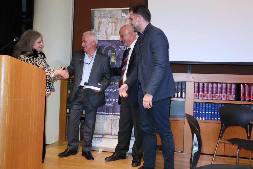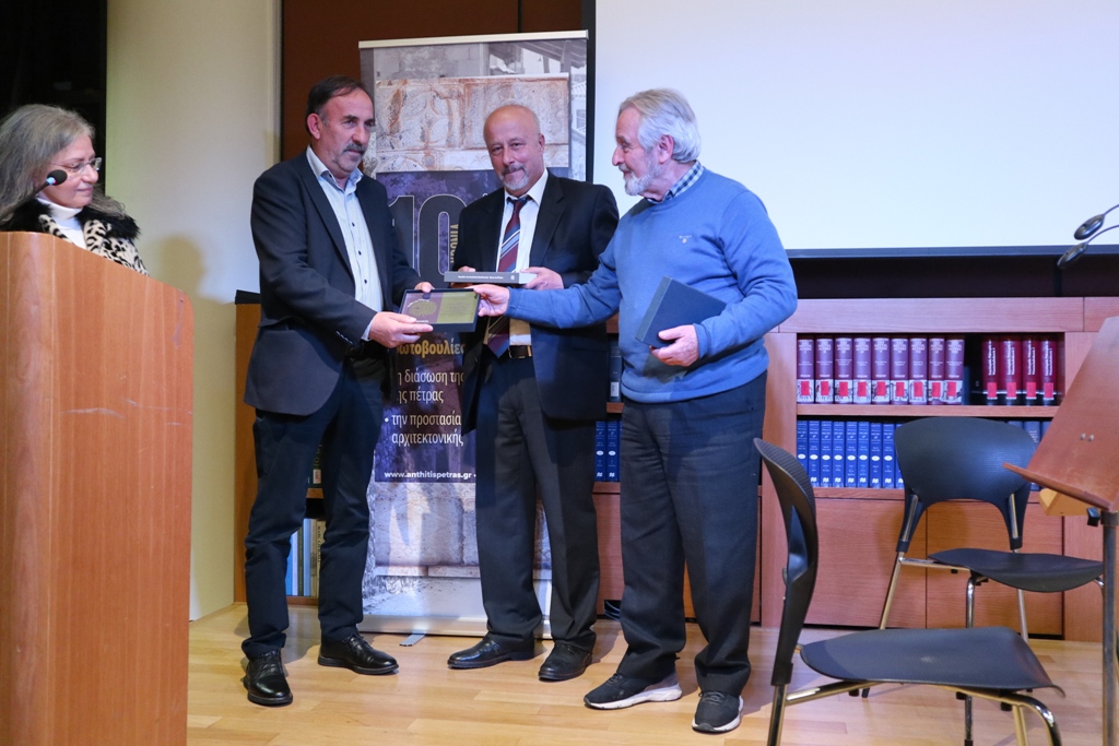 Στο δεύτερο μέρος της εκδήλωσης, τα ΑΝΘΗ ΤΗΣ ΠΕΤΡΑΣ, απένειμαν 10 τιμητικές πλακέτες ( συμβολικά για τα 10 χρόνια παρουσίας του σωματείου). Συγκεκριμένα τιμήθηκαν οι τρεις πρωτομαστόροι Π. Γκιώκας, Στ. Καγιούλης και Παν. Τσαφαράς, 5 πολίτες (με σημαντική συνεισφορά στο έργο μας) Ηλ. Γιαννικόπουλος, Γ. Κατσιούφης, Κ. Πολωλός, Σ. Μαυρογενίδου και Ανδρ. Πλουμπίδης και 2 εταιρείες (ΟΜΙΛΟΣ ΗΡΑΚΛΗΣ και ATLANTIC BULK CARRIERS MANAGEMENT LTD), που υποστηρίζουν τις δράσεις των ΑΝΘΕΩΝ.