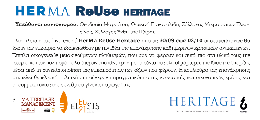 Το τριήμερο 30 Σεπτεμβρίου – 2 Οκτωβρίου 2016 διοργανώνεται στο παλιό Ελαιουργείο της Ελευσίνας (υποψήφια Πολιτιστική Πρωτεύουσα 2021) το 3ο Διεθνές Συνέδριο Διαχείρισης Πολιτιστικής Κληρονομιάς.