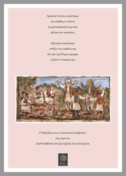 Ο πίνακας «Πάσχα-ελληνική γιορτή» του λαϊκού ζωγράφου Θεόφιλου κοσμεί τη φετινή πασχαλιάτικη κάρτα των Ανθέων της Πέτρας. Παράλληλα συνυπάρχουν οι γνώριμες ευχές του Διοικητικού Συμβουλίου, εμπνευσμένες αφ’ ενός από τη μαστορική ...