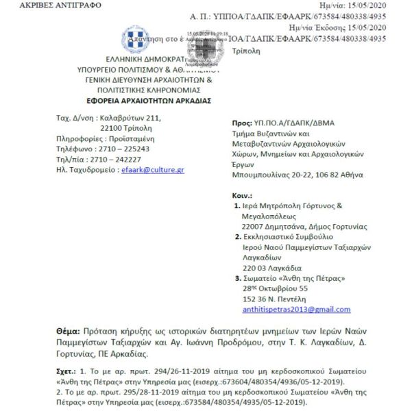 Θετική εισήγηση της Εφορίας Αρχαιοτήτων Αρκαδίας στο αίτημα των Ανθέων της Πέτρας για την κήρυξη των εκκλησιών του Προδρόμου και των Ταξιαρχών Λαγκαδίων ως μνημεία