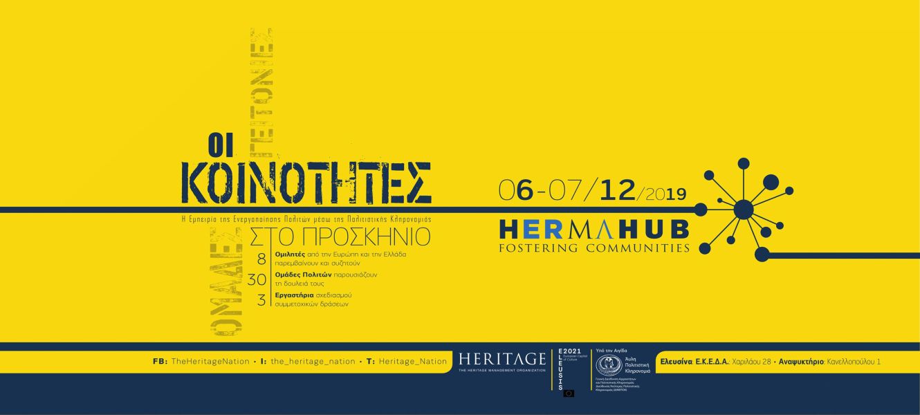 Στις 6 και 7 Δεκεμβρίου, θα πραγματοποιηθεί στην Ελευσίνα το συνέδριο “Οι Κοινότητες στο Προσκήνιο: Η Εμπειρία της Ενεργοποίησης Πολιτών μέσω της Πολιτιστικής Κληρονομιάς” (HerMa HUB: Fostering Communities), που οργανώνει ο μη κερδοσκοπικός οργανισμός The Heritage Management Organization (HERITΛGE) σε συνεργασία με την Ελευσίνα 2021 Πολιτιστική Πρωτεύουσα της Ευρώπης. Ο οργανισμός The Heritage Management Organization (HERITΛGE), φέτος τον Σεπτέμβριο, συμπλήρωσε δέκα χρόνια δράσης. Από το 2008, χάρη στην εκπαίδευση που παρέχει, καλλιεργεί δεξιότητες σε σημαντικούς διαχειριστές έργων της παγκόσμιας πολιτιστικής κληρονομιάς, για να προαγάγουν το αντικείμενό τους, από ένα πεπερασμένο αντικείμενο έρευνας, σε μία ζωντανή, αειφόρο πηγή παιδείας, τοπικής περηφάνιας και οικονομικής ευημερίας.