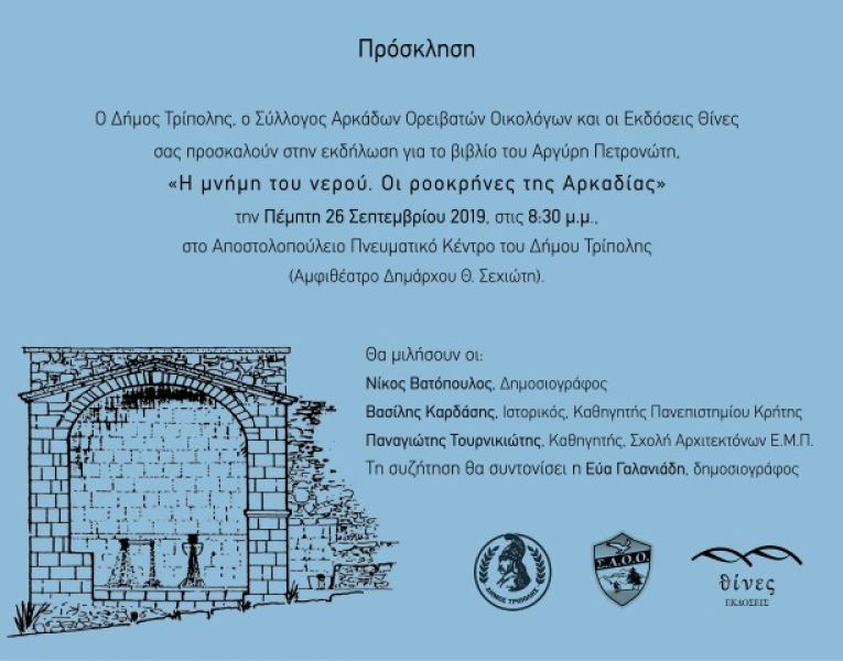 Πρώτος σταθμός τα Λαγκάδια τον περασμένο Ιούλιο, στο πλαίσιο των Γιορτών της Πέτρας που διοργανώνουν τα τελευταία έξι χρόνια τα Άνθη της Πέτρας! Αύριο 26 Σεπτεμβρίου ο επόμενος σταθμός, η Τρίπολη, ο τόπος καταγωγής του συγγραφέα. Πρόκειται για το τελευταίο βιβλίο του Αργύρη Πετρονώτη με τίτλο «Η μνήμη του νερού - Οι ροοκρήνες της Αρκαδίας». Μια καλαίσθητη έκδοση σε εξαιρετική επιμέλεια της Ζιζής Σαλίμπα από τις εκδόσεις «θίνες». Ο επίλογος του βιβλίου περιλαμβάνει την αυτοβιογραφική διαδρομή του μαστρ’ Αργύρη που καταλήγει ως εξής: « … Από το 2014 προσφέρω από καρδιάς, όσο μπορώ, στον νεοπαγή Όμιλο Φίλων Λαϊκής Αρχιτεκτονικής «Άνθη της Πέτρας»...