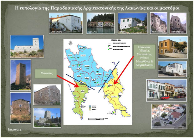 Τα παραδοσιακά κτίρια της Λακωνίας, από πλευράς τυπολογίας των κυρίαρχων τύπων, μπορούν να καταταγούν σε τρεις κύριες ομάδες, όπως φαίνεται και στον διπλανό χάρτη, [Εικόνα 3] :